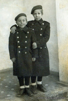 Diciembre, 1941. Mi hermano mayor y yo en los porches del Hogar Alto de los Leones. La visita hace tiempo que la olvidé, pero quien quiera que fuera quien nos hizo la foto a mí me sacó -- a pesar de los pesares--optimista y emprendedor, casi entusiasta. ¡Bravo, chaval!. Foto: Ernesto Fernández.