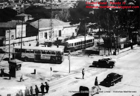 La parada 10 vista desde el cine Ciudad Lineal. Una gran actividad taxis, tranvías, autobuses,... con un kiosco de gallinejas, otro de prensa, una fuente y el bar la Tierruca con su terraza en una de las casas.